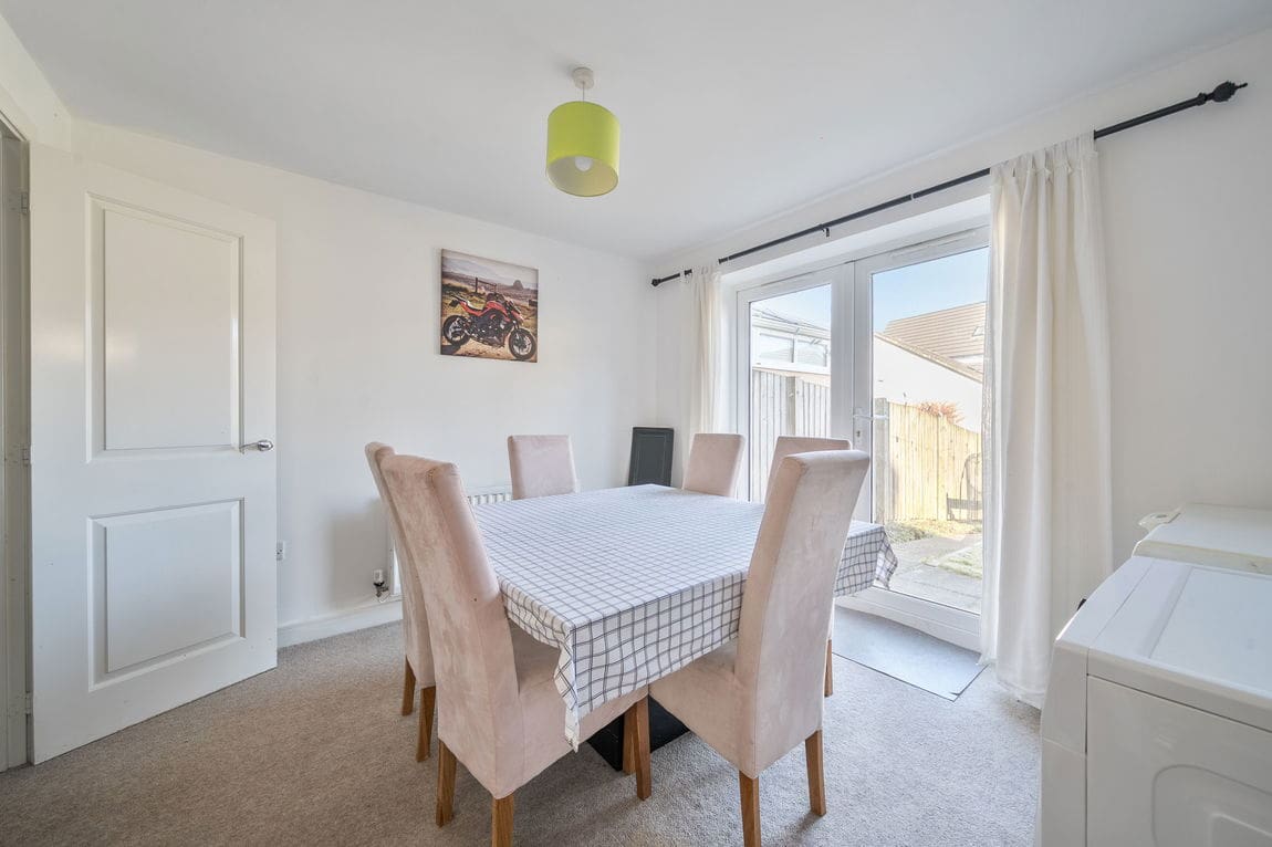 The dining area has double glazed French doors onto the rear garden. The kitchen has a rear facing window and glazed door to the side of the property, a range of base and wall units with wood-effect laminated work surfaces, 4-ring gas hob with stainless steel splashback and extractor unit over and integral double oven with pan storage above and below. There is a breakfast bar with inset 1½ bowl stainless steel sink with integral dishwasher and cupboards under.