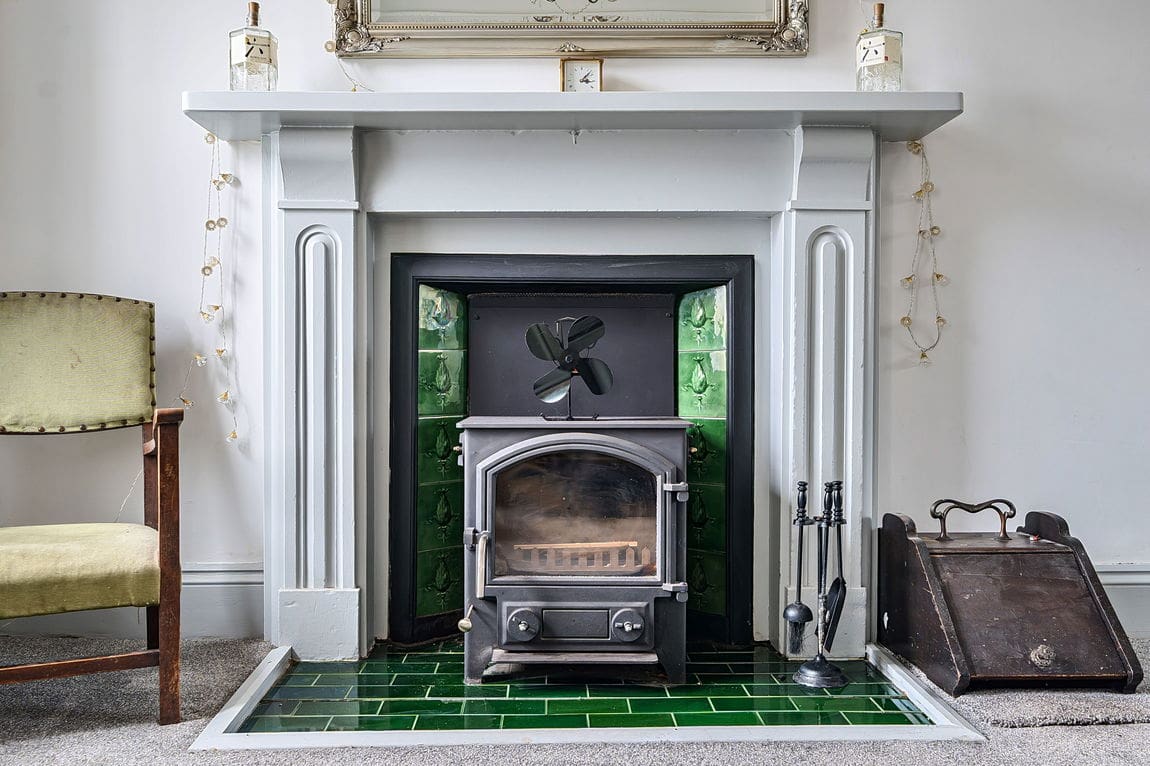 21’ (6.45m) x 14’2 (4.31m) living room with windows to the front and rear with attractive shutters, feature fireplace with a multi-fuel wood burner, built in cupboard housing the boiler and pump for the well.