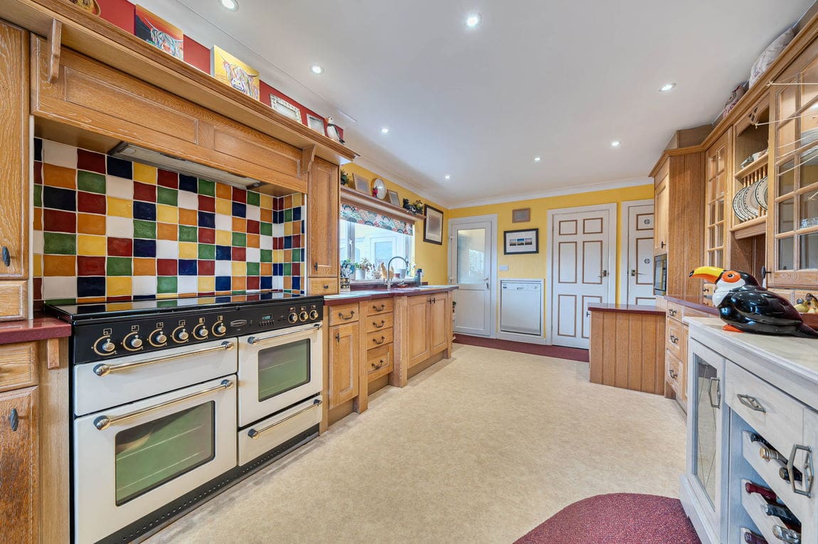 The well-appointed kitchen/breakfast room has windows to the front and side, offering a range of base and wall mounted units with Corian worktops, inset 1½ bowl sink with mixer tap, built-in microwave, Range cooker with extractor over, space for dishwasher, cupboard housing the fridge/freezer and a larder cupboard. Door to utility/boot room with storage cupboards and door to rear porch with space and plumbing for washing machine and tumble dryer. Integral garage with electric door, power and light connected.
