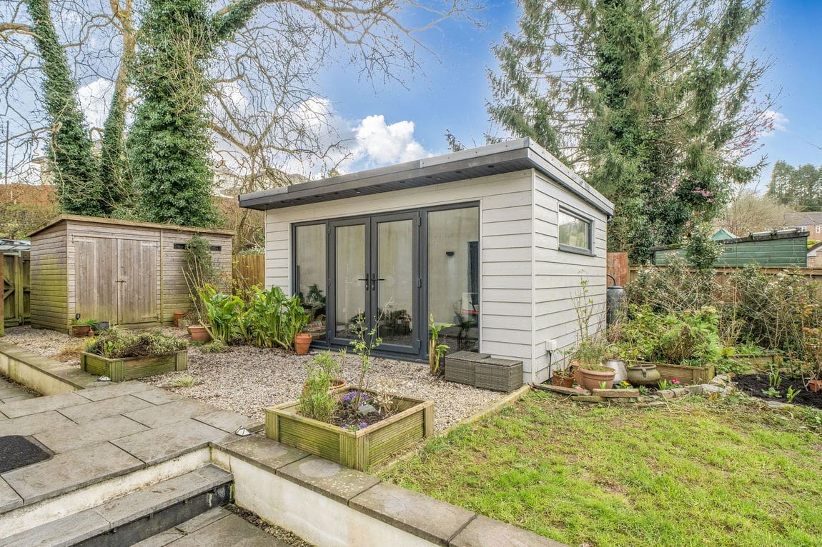 A pedestrian gate to either side of the property leads to the rear garden which is laid mainly to lawn with well-defined fence boundaries and low maintenance gravelled flower beds. Detached purpose-built home office/garden room with windows and glazed door to the front. Garden shed.