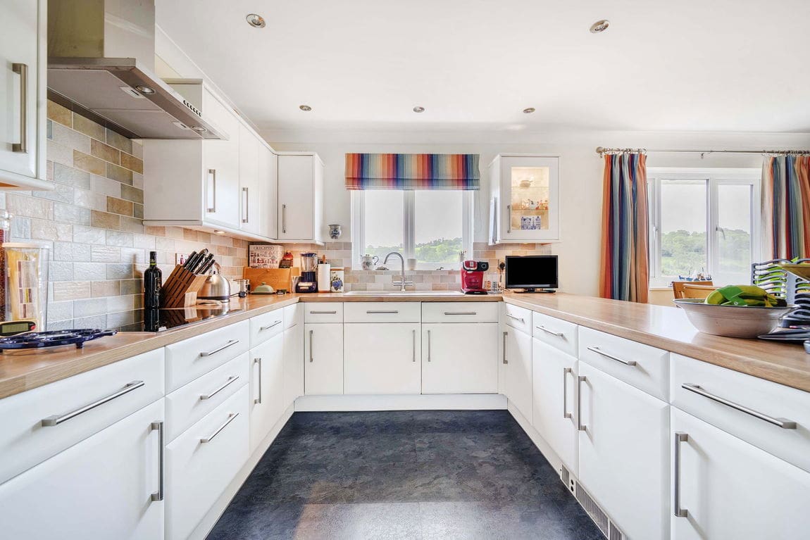 Glazed double doors open into the redesigned kitchen/dining room providing a light and airy space with a range of fitted base and wall units with wood effect laminate worksurface, integral appliances including induction hob with extractor over, electric double oven with pan storage above and below and American style fridge/freezer. Peninsular area separates the kitchen from the dining area with views to the surrounding countryside. Door from the kitchen into the integral garage.